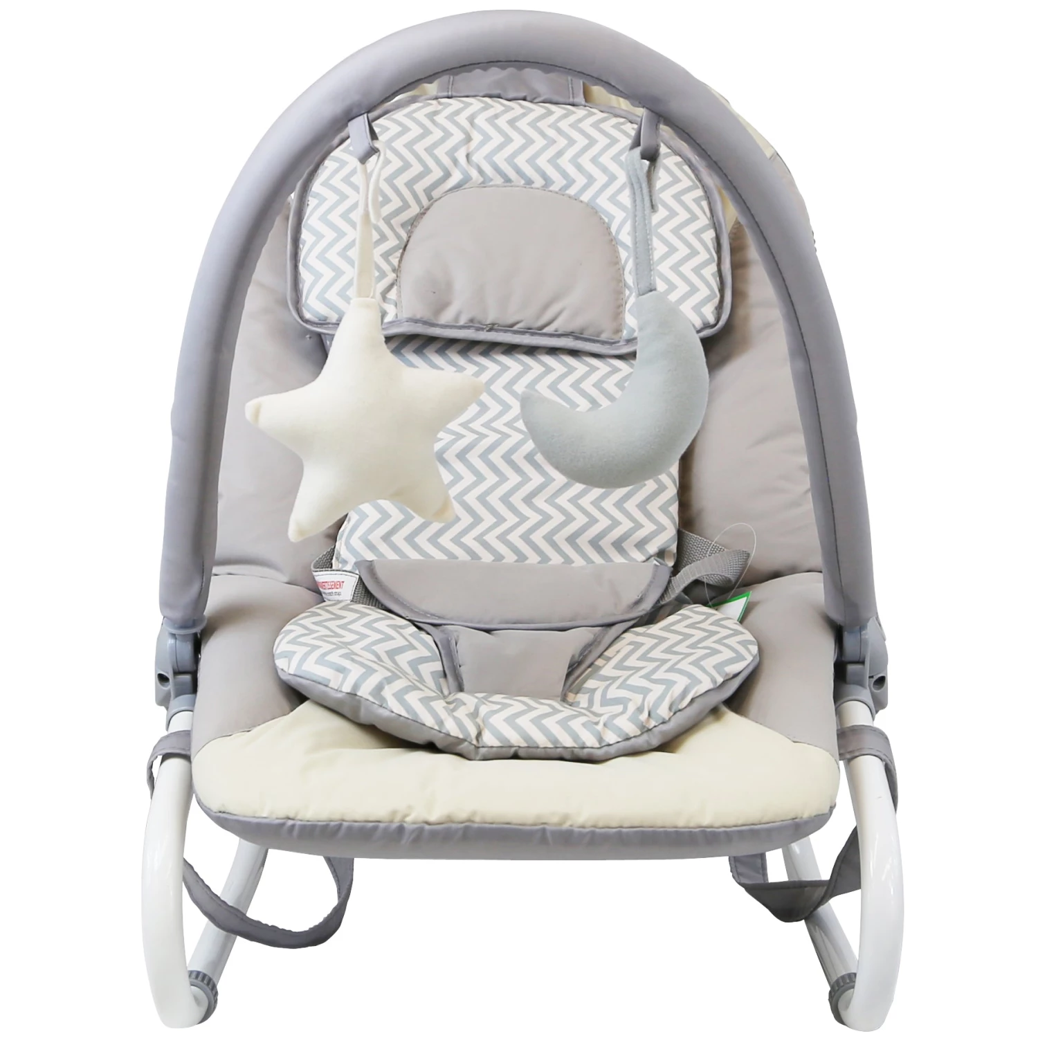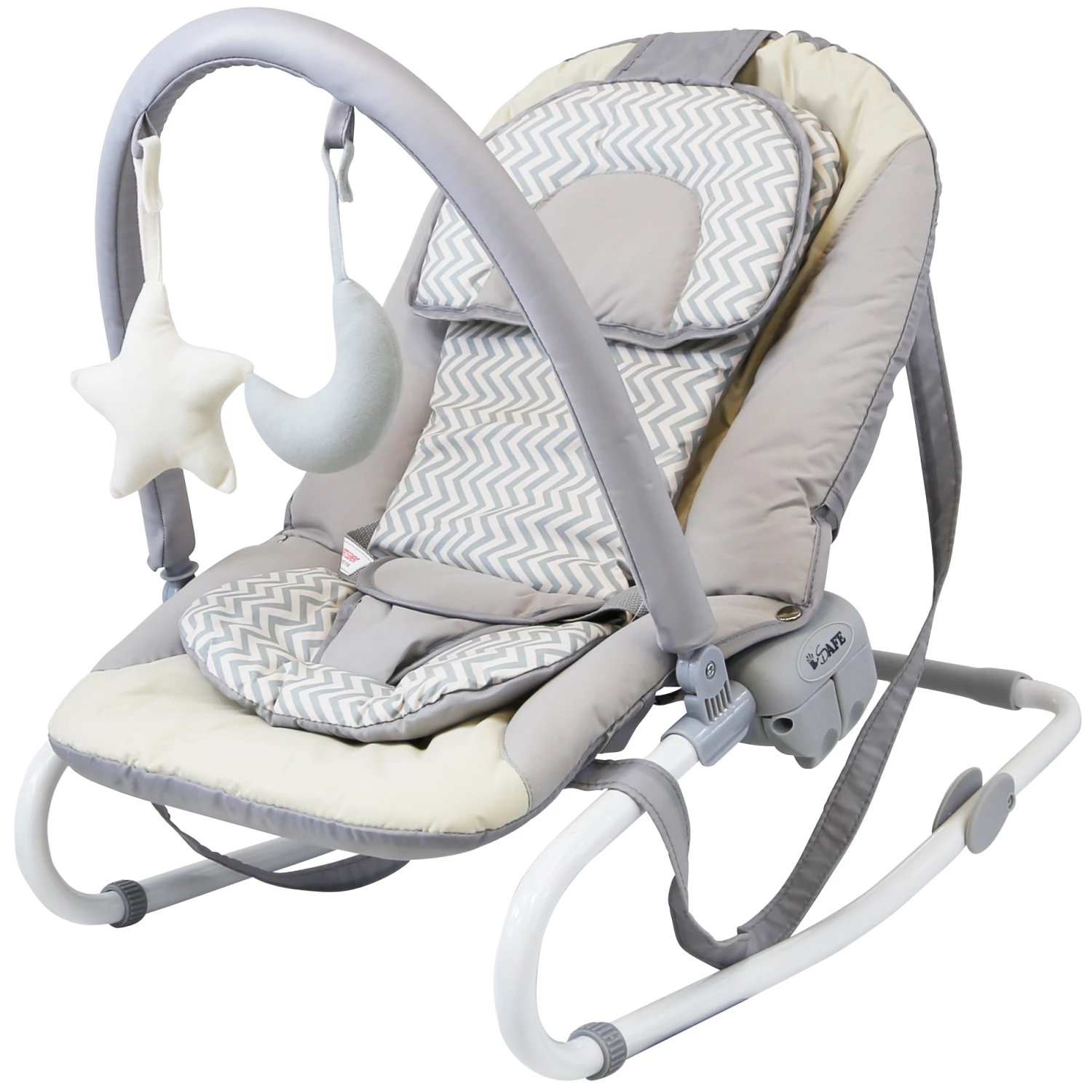 The Isafe Baby Bouncer Rocker Includes a Soft Padded Cushion, Height Adjustable / Removable Head Rest Cushion, Adjustable Back Rest With 3 Positions, Adjustable Calf Support With 2 Positions, Adjustable Removable Toy-bar, Carry Handles, Rock & stop Function.