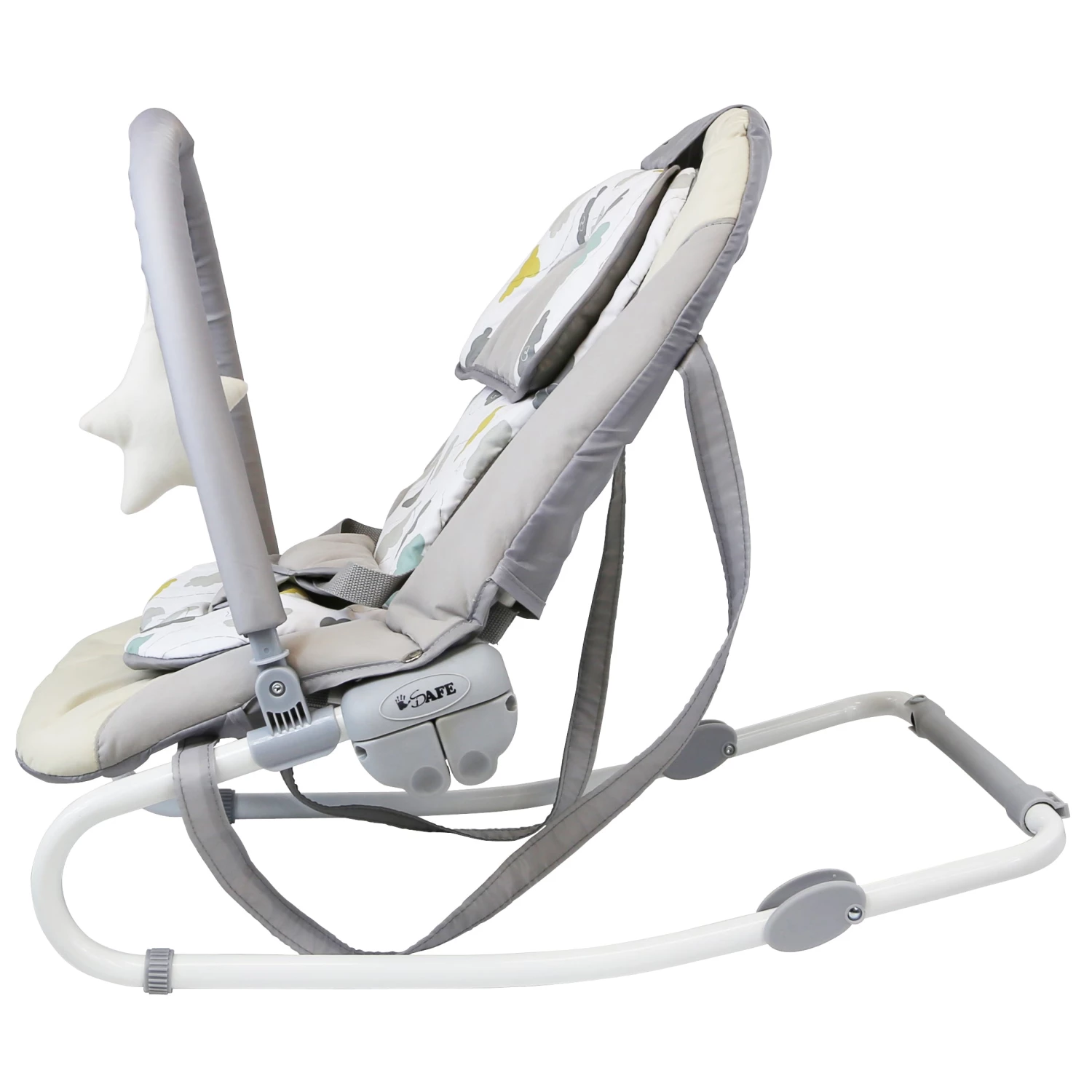 The Isafe Baby Bouncer Rocker Includes a Soft Padded Cushion, Height Adjustable / Removable Head Rest Cushion, Adjustable Back Rest With 3 Positions, Adjustable Calf Support With 2 Positions, Adjustable Removable Toy-bar, Carry Handles, Rock & stop Function.