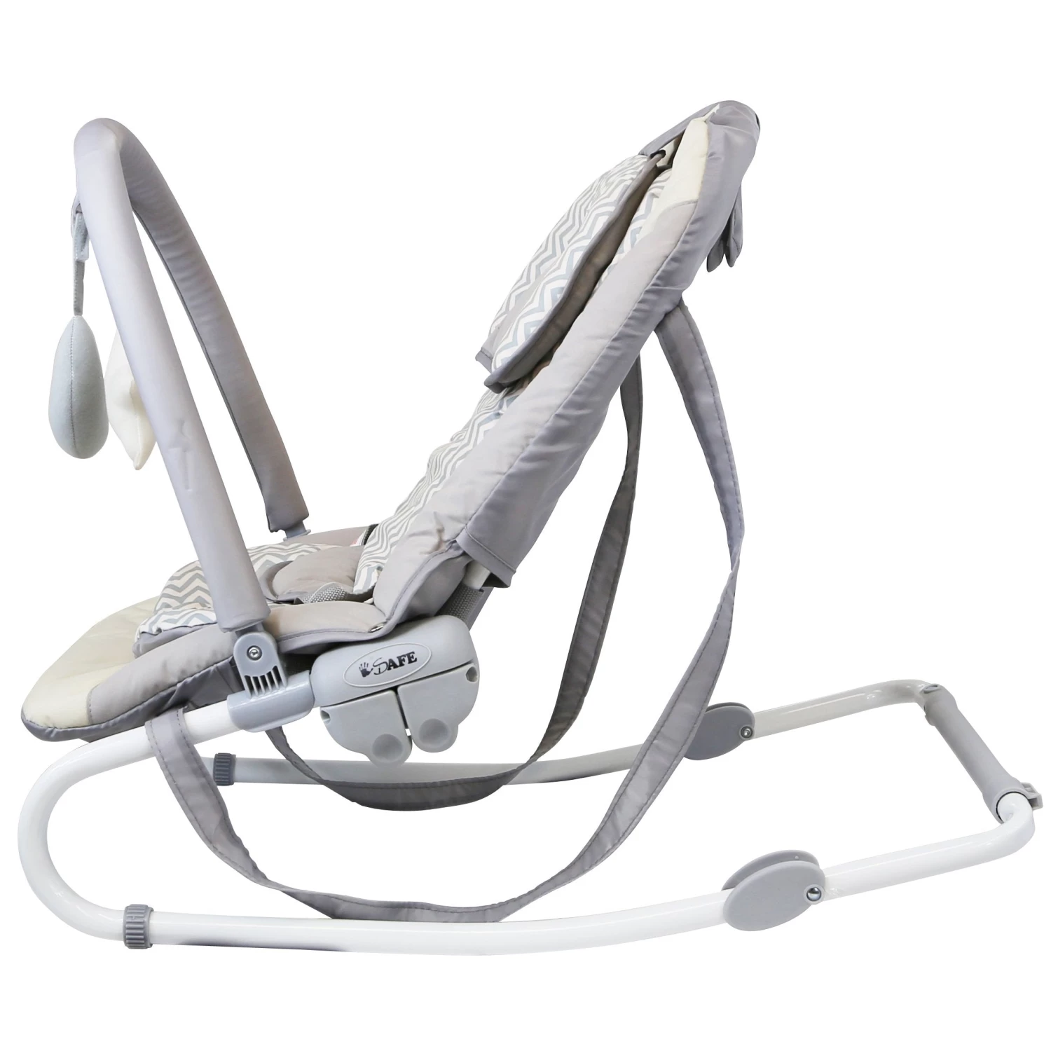 The Isafe Baby Bouncer Rocker Includes a Soft Padded Cushion, Height Adjustable / Removable Head Rest Cushion, Adjustable Back Rest With 3 Positions, Adjustable Calf Support With 2 Positions, Adjustable Removable Toy-bar, Carry Handles, Rock & stop Function.